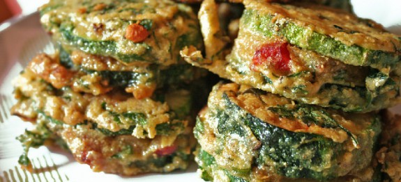 Montaje: Tomamos uno por uno los medallones de zucchinis ya cortados y vamos formando unos sándwichs con el relleno de pasta de morrón. A continuación los vamos pasando por el rebozado de garbanzos y finalmente por la harina de arroz.